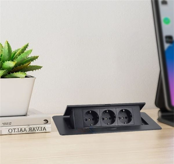 Sill funksionalitet dhe elegancë në hapësirën tuaj të punës me këtë prizë të integruar për tavolinë. E dizajnuar për t’u montuar në mënyrë diskrete, ajo hapet vetëm kur ju nevojitet dhe fshehet përsëri për një pamje të pastër dhe moderne.