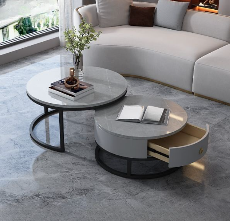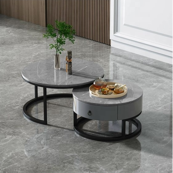 Set Tavolinash Rrethore me Sipërfaqe Qeramike – Dizajn Minimalist dhe Materiale Cilësore